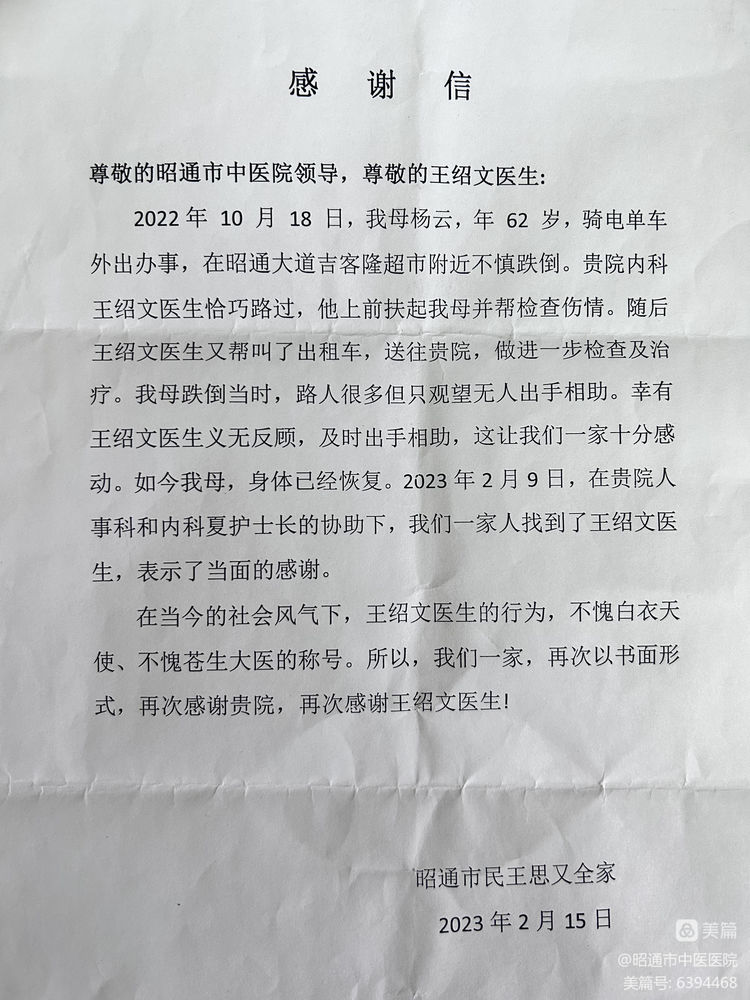 对医护人员来说,什么是最好的赞誉?因为职责,所以坚守。因为理解,所以值得。在这个通讯发达的时代,一封亲手送来的感谢信,更显得弥足珍贵,患者的信赖和认可,见证的是浓浓医患情,更是对医护最好的褒奖。近日,昭通市中医医院收到一封患者家属的感谢信,感谢我院内科王绍文医生的爱心救助,字里行间充满着对昭通市中医医院医护人员的赞赏和感激。