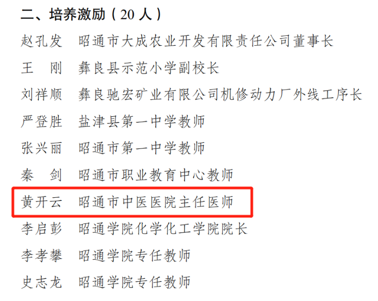 为深入学习贯彻习近平总书记关于人才工作的系列重要讲话精神,充分认识人才工作的重大意义,牢固树立“人才资源是第一资源”观念,按照《昭通市“兴昭人才支持计划”实施办法》相关要求,近日,中共昭通市委人才领导小组办公室公布第一批“兴昭人才支持计划入选人才和团队”名单,我院刘阳文、郑德勇、孔尚军、付明超4名医师入选行业骨干项目,黄开云医师入选培养激励项目。
