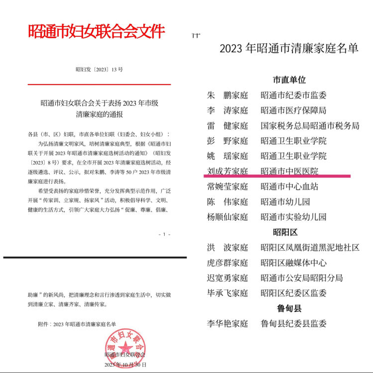 为弘扬清廉文明家风,培树清廉家庭典型,昭通市妇女联合会近期在全市开展2023年清廉家庭选树活动,我院儿保科主任刘成芳家庭荣获此殊荣。