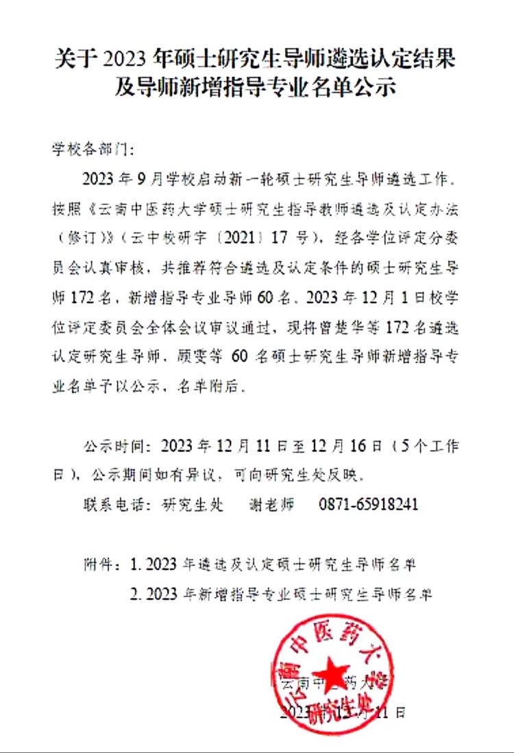 近日,云南中医药大学研究生院公布了《关于 2023年硕士研究生导师遴选认定结果及导师新增指导专业名单》,我院刘阳文、陶永华、申晓东、孔尚军4名医师被确定为硕士研究生导师。至此,我院共拥有硕士研究生导师9人,涵盖针灸推拿科、眼科、内科、外科、儿科、老年病科、急诊科等多个培养方向。