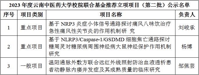 近日,云南省中医药基础研究联合专项管理办公室、云南中医药大学校院联合基金管理办公室陆续公布2023年度科研项目评审结果,我院肾病风湿科科研立项再获佳绩,此次立项包括联合专项面上项目2项、青年项目1项,以及校院联合基金重点项目2项、一般项目1项。目前,肾病风湿科共有科研项目13项、云南省中医药高层次人才培养对象项目2项,总资助经费达到178万元。