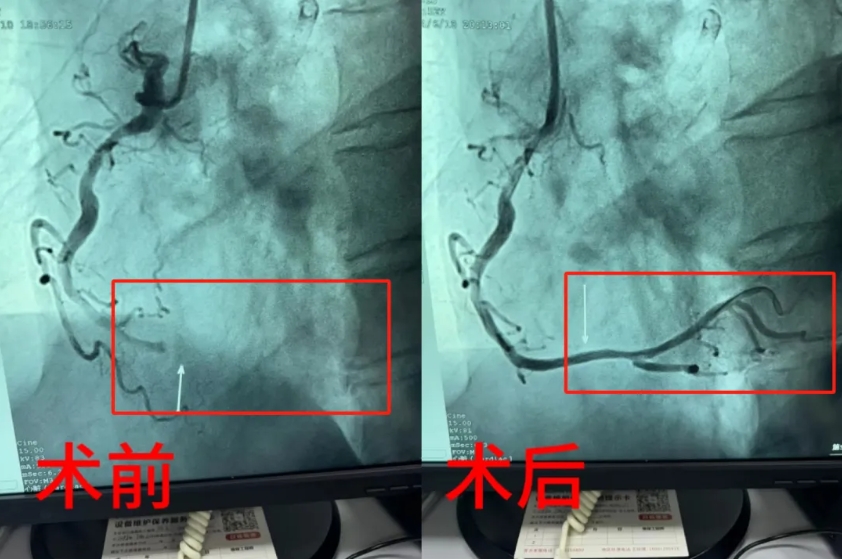 6月10日凌晨3时许,一名52岁的男性患者因睡眠时胸骨后疼痛、心悸和呼吸困难等症状,患者自认为是胃病发作,自行口服药物后症状未缓解,后就诊于我院胸痛中心。医护人员迅速接诊并完善心电图检查,诊断为急性非ST段抬高型心肌梗死。胸痛中心迅速为患者给予了药物治疗,然而患者症状仍未明显缓解。在与患者及家属充分沟通后,胸痛中心决定为患者实施急诊冠脉介入治疗,冠脉造影示:左主干中远段狭窄40%,前降支狭窄80%,回旋支狭窄50%,右冠脉远端完全闭塞。经过紧张的手术操作,成功在患者右冠病变处置入一枚支架,使患者症状得到缓解并转入病区继续后续治疗。