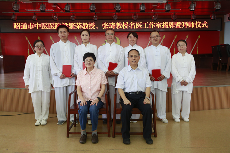 随后,举行了梁繁荣教授、张琦教授名医工作室揭牌仪式及富有中医特色的拜师仪式。7名传承人身着正装向师傅鞠躬敬茶,两位教授勉励徒弟要要勤学钻研、传承国粹、弘扬中医,让中医药更好地惠及百姓、服务群众。