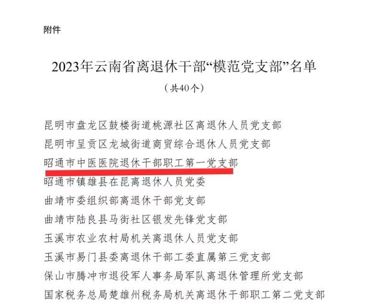 近日,我院退休干部职工第一党支部被省委老干局命名为“2023年云南省离退休干部‘模范党支部’”。