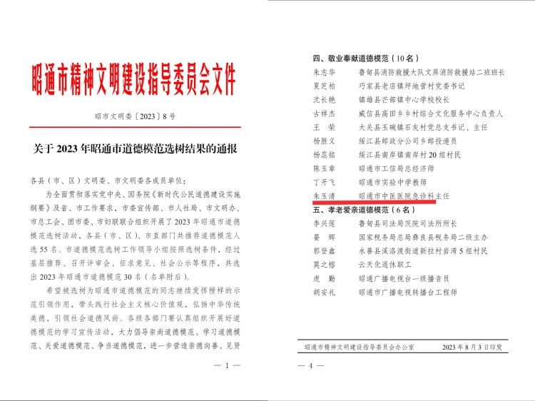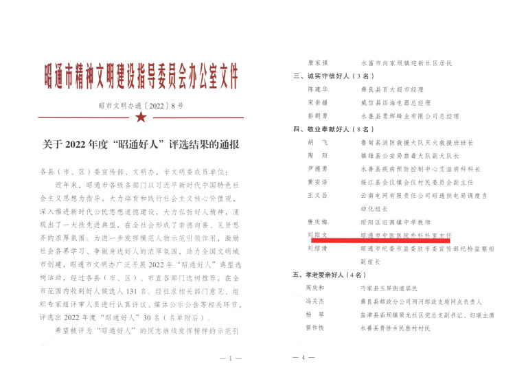 近年来,为进一步发挥模范人物的示范引领作用,昭通市文明办开展了一系列典型选树活动。我院刘阳文同志和朱玉清同志在选树活动中脱颖而出,分别荣获2022年度“昭通好人”和2023年“昭通市道德模范”荣誉称号。